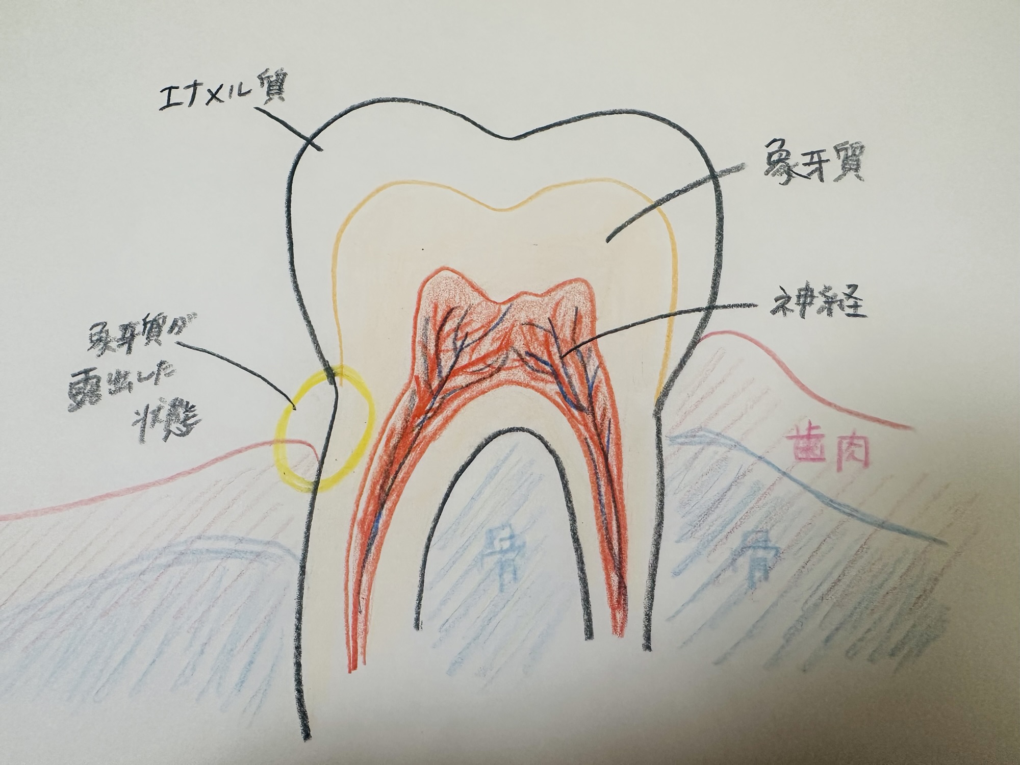 歯のマメ知識 知覚過敏に効く歯磨き粉🪥 2026.01.23 植田 裕美子 みなさんこんにちは🤩 堺市 北区 北花田 さかなか歯科の植田です! 寒波で寒い日々が続きますね🥶🥶 当院ではブランケットもご用意しておりますので、お部屋が寒かったり足元が冷える方は遠慮なくお申し付けください✨ さて、寒い冬は水道のお水も冷たく知覚過敏に悩まされる方も多いのではないでしょうか? 本日は知覚過敏についてと、知覚過敏に特化した歯磨き粉をご紹介いたします🦷🩵 知覚過敏とは? まず知覚過敏とは、虫歯ではないのに冷たいものがしみる・歯ブラシをあてるとしみる・風などの刺激でしみるなどの症状で、『象牙質知覚過敏症』とも呼ばれます。 知覚過敏症状は、歯の内側にあるやわらかい『象牙質』が露出してしまうことで発生します⚡️ 象牙質には無数の象牙細管が歯の中心に向かって伸びています。象牙質が剥き出しになると、外部からの刺激が象牙細管を通って歯の神経に伝わり、瞬間的に鋭い痛みを感じるようになります。これが知覚過敏症状の仕組みです。 なぜ知覚過敏になるの? 知覚過敏症状が出る状態になってしまう原因はたくさんありますので順番にご説明いたします📝✨ 1、歯周病 歯周病は初期段階ではほとんど自覚症状が無いため、ほとんどの場合は気づかないうちに進行していきます。進行すると歯の根本の骨が溶かされていくため、それにあわせて歯茎が下がってしまいます。 すると先ほどの図のように象牙質が露出して知覚過敏症状の原因になります。 対策 歯周病はまずは歯科での専門的な治療を受けることが必要です。治療後は自宅での適切なケアと定期的に歯科検診に通う予防歯科が重要となります。 2、強い力での歯磨き 歯磨きの際にゴシゴシと力を入れすぎることで、歯茎を痛め、歯茎が退縮してしまうことがあります。歯茎が退縮することで象牙質が露出して知覚過敏症状の原因になります。 対策 間違えた歯磨きの仕方や硬すぎる歯ブラシなどには要注意ですので、適切な力加減と適切な歯ブラシでケアすることが大切です。歯科医院では虫歯治療・歯周病治療だけではなく、歯ブラシの使い方の指導などもしていますのでまずは適切なケアを知ることが大切です。 3、加齢 歯茎の位置は年齢を重ねるとともに少しずつ下がってくると言われています。それに伴い歯の根元が露出し象牙質が露出することで知覚過敏症状の原因となります。 対策 こちらも歯周病と同じでまずはしっかりケアをし、定期的に歯医者に通うことが大切です! 4、歯ぎしりや強い噛み合わせ 歯ぎしりや歯を強く噛み合わせることにより歯がすり減ってしまい表面のエナメル質がすり減り、象牙質が露出してくることで知覚過敏症状の原因になることがあります。 また、歯ぎしりが原因で歯の根元に力がかかり根元がくさびのように削れてしまうことで象牙質が露出してしまうこともあります。 このような状態を『くさび状欠損』といい、これは先ほど紹介した強い歯ブラシが原因でおこることもあります。 対策 歯ぎしりや噛み合わせによる歯の負担には、マウスピースを使うことで負担を軽減する方法があります。材質もがいくつかございますので歯科で相談してみましょう! 5、歯が溶けている 歯を覆っているエナメル質は、酸で溶けてしまいます。これを酸蝕と言います。酸性度の高い食品を摂り過ぎてしまうとエナメル質が溶け出して象牙質が露出して知覚過敏症状の症状の原因となります。 対策 酸性度の高い食事や炭酸などを避けるか、もしも食事をしたあとはうがいなどで口をゆすぐようにしましょう。歯磨きをする場合は酸で柔らかくなったエナメル質を守るため、30分ほど時間をあけてから歯磨きするようにしましょう。 歯磨き粉での知覚過敏予防 当院でも販売しております、『メルサージュ ヒスケア』という歯磨き粉でも知覚過敏予防が出来ます✨🪥 このメルサージュヒスケアには、 刺激の伝達をブロックしてくれる硝酸カリウムと、 象牙細管を封鎖してくれる乳酸アルミニウム という2つの成分がW処方されています! また、歯肉の炎症を抑えるβ-グリチルレチン酸や、高濃度(1,450ppm)フッ素が歯の再石灰化を促してくれるため、歯周病予防・虫歯予防にも効果的です✨ その他にもステインを溶解除去してくれるポリエチレングリコール400(PEG-8)が入っているため、歯の着色汚れなどにも効果的という万能な歯磨き粉となっております!☺️ まとめ この歯磨き粉を使うことで知覚過敏症状が改善された方もたくさんいらっしゃいます。しかし、くさび状欠損までいくと、歯磨き粉では知覚過敏症状は抑えることが出来ないので歯科医院での治療が必要となります。その他にも原因に合わせて、マウスピースを作ったりお薬を塗ったりと必要な処置が変わってきますので、知覚過敏症状でお悩みの方はまずはご来院いただき、ご相談頂ければと思います☺️ この記事を書いた人 歯科助手 TC リーダー 植